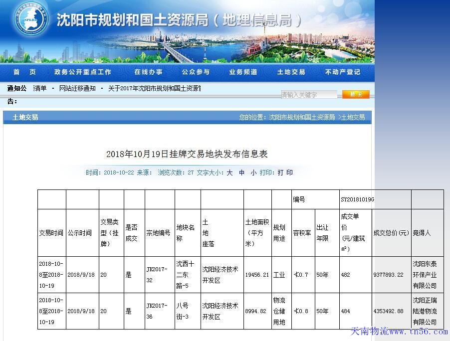 据沈阳市计划和国土资源局10月22日通告,于今年10月8日至10月19日挂牌交易的沈西十二东路-5地块、八号街-3地块已成交,竞得人分别为沈阳东泰绿色产业有限公司、沈阳货运正瑞陆港货运有限公司,总面积约28.45万平,计划用途分别为工业用地、货运仓贮用地。